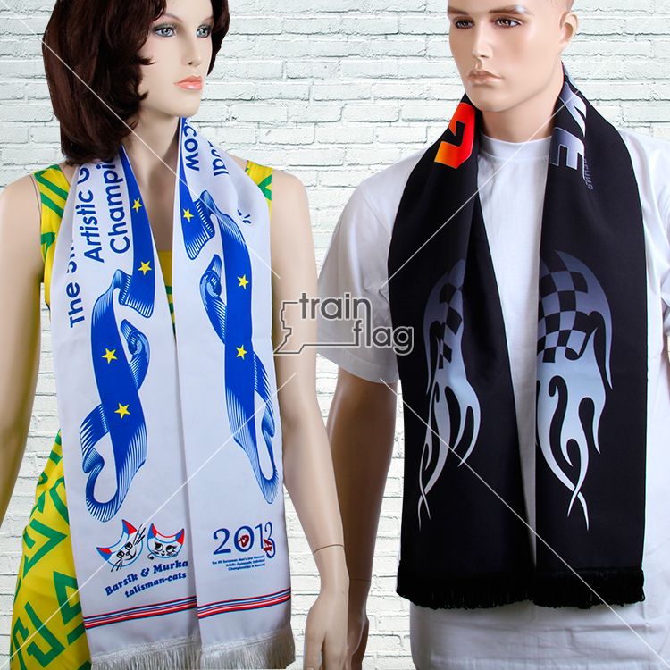 Комбинированные шарфы состоят из флиса с одной стороны, а с другой стороны любая сублимационная ткань по выбору со 100% запечаткой дизайном и логотипом, с бахромой или без.